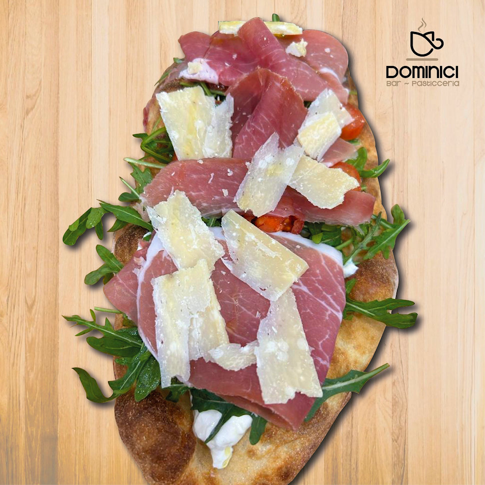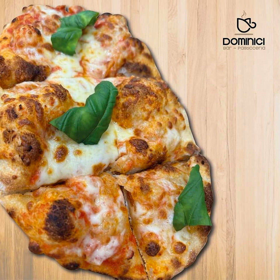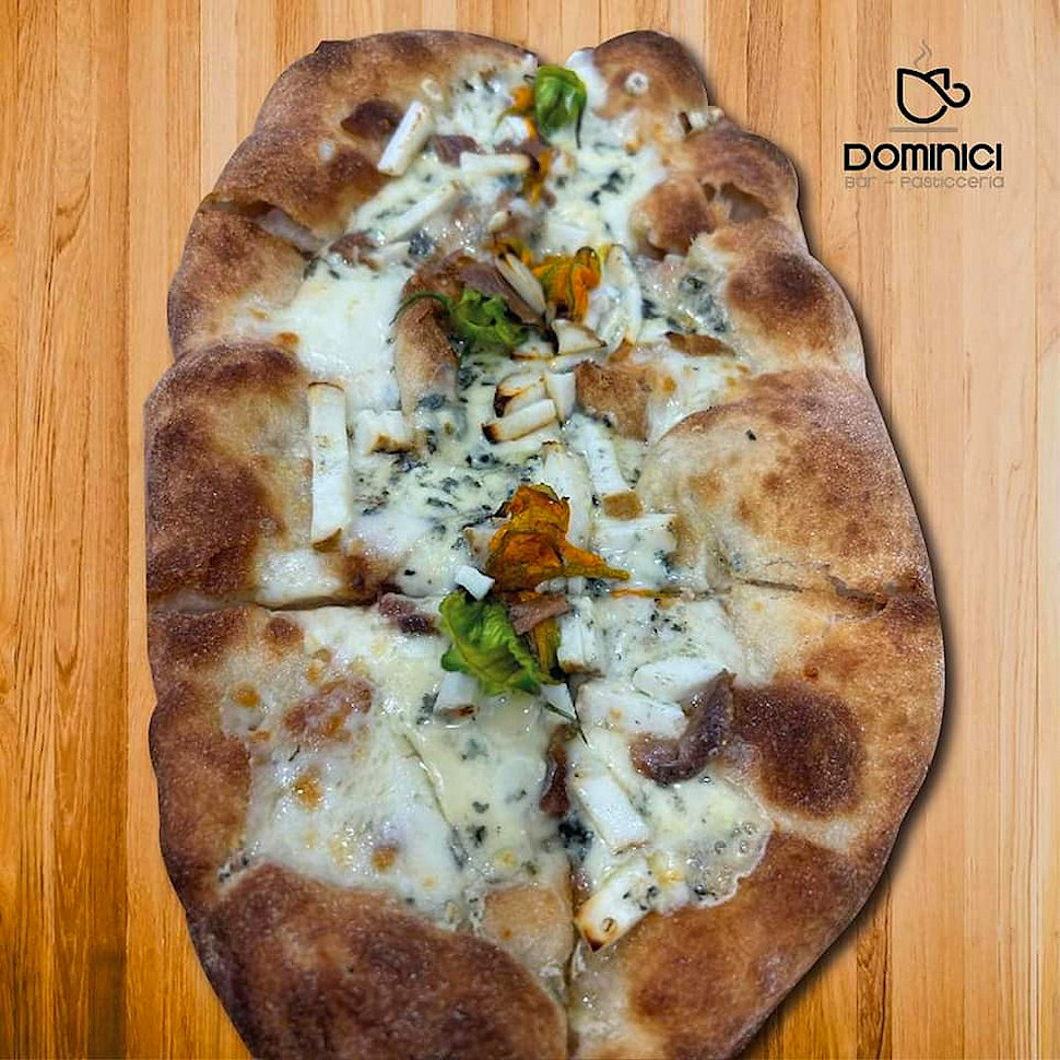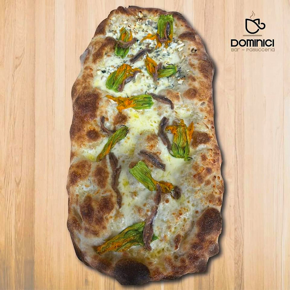 Se Monica è la regina della pasticceria, Francesco, che viene da una famiglia di panificatori, è un maestro della pinsa romana. Dominici è certificato ‘vera pinseria Romana’. Da Dominici viene fatta solo con la ricetta classica che utilizza un mix di farine diverse tutte certificate e autentiche: grano tenero, soia e riso impastate con acqua rigorosamente fredda e che si uniscono poi all’impasto Madre con una lievitazione lunghissima: fino a 150 ore. Questo rende la pinsa fragrante, digeribile e ipocalorica. E per farcire le pinse si utilizzano solo prodotti a chilometro zero!