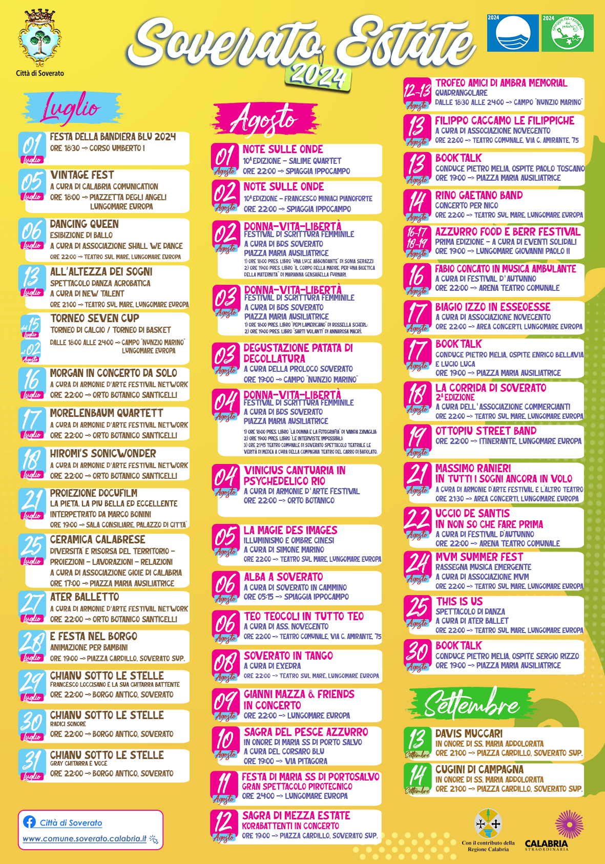 L’associazione Novecento proporrà poi le Filippiche con Filippo Caccamo il 13 agosto e Biagio Izzo in Esseoesse il 17. Il 13, il 17 e il 30 agosto sarà la volta di Book talk con Pietro Melia che intervisterà Paolo Toscano, Enrico Bellavia, Lucio Luca e Sergio Rizzo; il 14 Rino Gaetano Band. E ancora, dal 16 al 19 agosto prima edizione di Azzurro food e berr Festival a cura di Eventi solidali. Musica e divertimento grazie all’associazione Commercianti invece il 18 agosto con la seconda edizione della Corrida; il 19 agosto concerto itinerante di Ottopiù street band. Anche la musica emergente avtà il suo spazio con la rassegna Mvm Summer Fest il 24 agosto. A chiudere il ricco cartellone ci penseranno Davis Muccari e i Cugini di Campagna nelle serate del 13 e 14 settembre in piazza Cardillo a Soverato superiore in onore di SS Maria Immacolata.