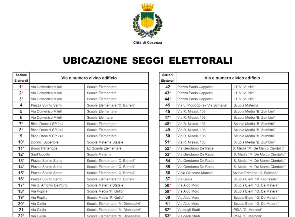 Saranno 82 le sezioni elettorali disseminate sul territorio cittadino (in allegato l’elenco completo). L’ufficio elettorale del Comune ha comunicato, già nei giorni scorsi, lo spostamento di alcuni seggi elettorali approvato dalla Commissione elettorale Circondariale. In particolare i seggi elettorali n.7, 8 e 9 sono stati trasferiti dall’edificio dell’ex scuola elementare di Donnici Inferiore, “Suor Elena Aiello” (strada Provinciale n. 84) all’edificio di località Bivio Donnici, Strada provinciale 241 (ex SS19) che fa parte dell’Istituto Comprensivo Cosenza 1 Zumbini, attualmente adibito a scuola elementare e media. Un altro spostamento ha riguardato i seggi elettorali n. 29, 30 e 45 dalla sede della ex scuola di via Francesco Principe, già via Asmara, alla sede della scuola dell’infanzia di Via L. Picciotto, già via Somalia, che fa parte sempre dell’Istituto Comprensivo Cosenza 1 Zumbini.