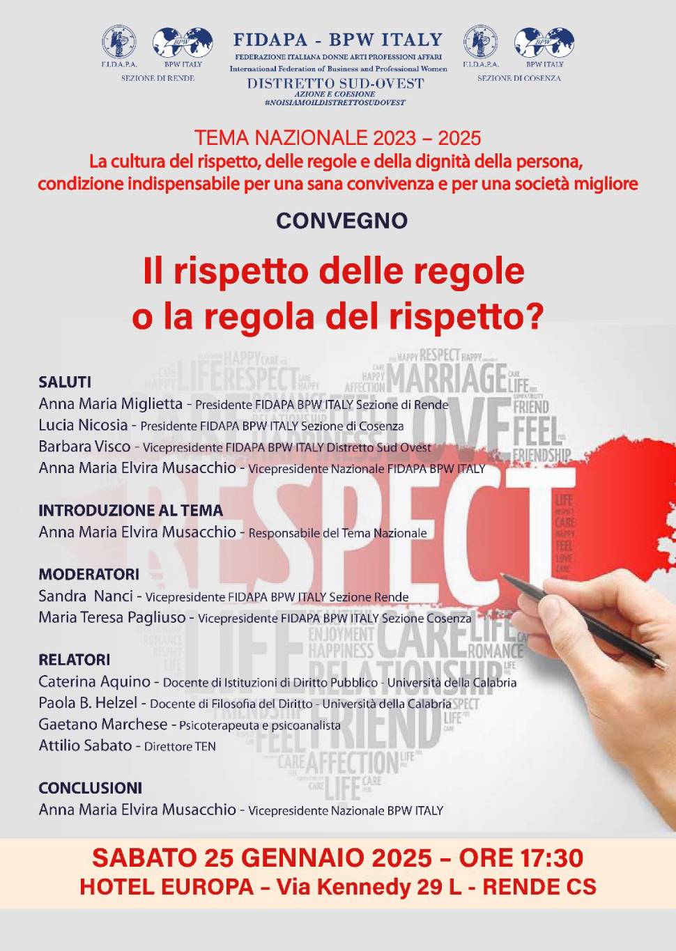 RENDE – Domani, sabato 25 gennaio alle ore 17.30, l’Hotel Europa ospiterà un evento di rilevanza culturale e sociale: il convegno dal titolo “Il rispetto delle regole o la regola del rispetto?”. L’iniziativa, promossa dalla Fidapa BPW Italy (Federazione Italiana Donne Arti Professioni Affari) sezione di Cosenza, in collaborazione con la sezione di Rende, si pone al centro del tema nazionale 2023-2025 della federazione: “La cultura del rispetto, delle regole e della dignità della persona, condizione indispensabile per una sana convivenza e per una società migliore”.