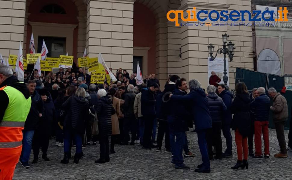 COSENZA – Ad alzare la testa in senso letterale – secondo l’invito del Movimento 5 Stelle – il cielo nel pomeriggio si è aperto, non ci sono nuvole, la pioggia (che non è arrivata) ha smentito le previsioni e la manifestazione di protesta organizzata a Cosenza si sarebbe potuta fare tranquillamente in pieno centro, su corso Mazzini. Ed invece militanti, forze politiche, comitati, simpatizzanti, associazioni, elettori e semplici curiosi hanno raggiunto il centro storico, nuova location dove alla vigilia era stato dirottato l’appuntamento per scongiurare il rischio temporale.