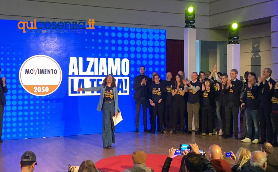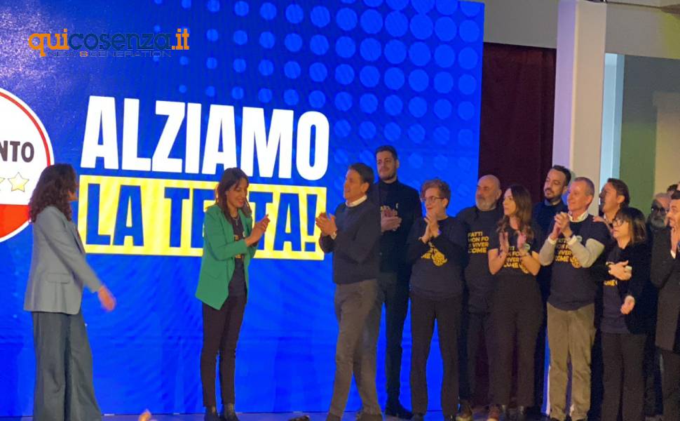 Nell’auditorium all’interno del liceo Bernardino Telesio non è rimasto spazio neppure per fare entrare una mosca. È sempre Anna Laura Orrico a salire sul,palco ed a prendere la parola: “Grazie! Grazie ! Grazie!”, ripete tre volte con entusiasmo e soddisfazione. Stracolmo, non si respira. Posti esauriti, non c’è un buco libero, pure i corridoi sono occupati dalla folla rimasta in piedi. Qualcuno litiga per farsi spazio in avanti. Sono venuti da ogni parte della regione, spicca lo striscione di Strongoli. Ci sono molte bandiere e non sono quelle dello stadio San Vito dove il Cosenza in questi stessi minuti sta perdendo miseramente contro il Pisa. Un tifoso del Movimento e dei lupi si fa scappare: “Siamo venuti a piangere il morto”, che appunto non è la politica (forse anche la politica) ma la retrocessione in serie C.