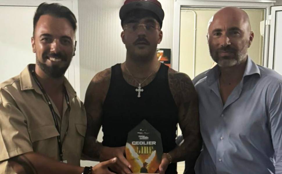 Il direttore artistico Alfredo De Luca insieme al sindaco Achille Ordine hanno consegnato a Geolier il premio miglior Live 2024.