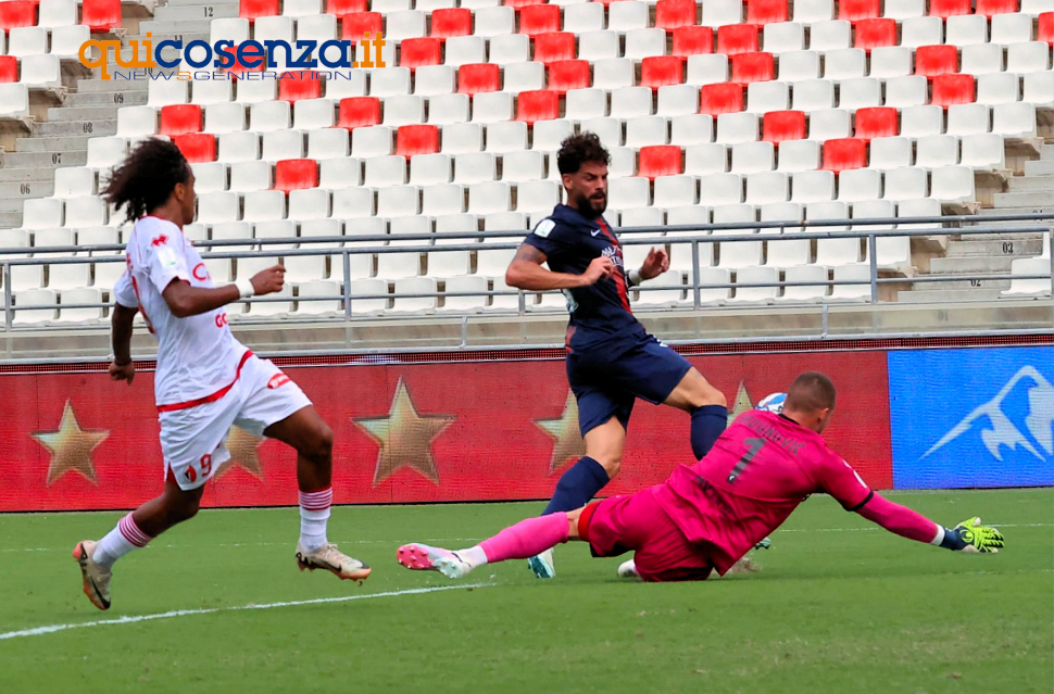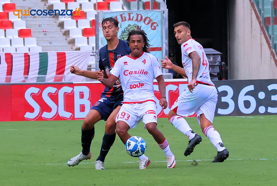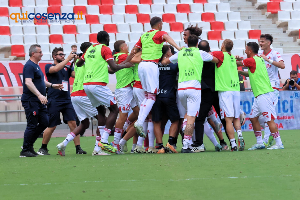 Avvio equilibrato con leggero predominio da parte dei padroni di casa. È dei rossoblù la prima conclusione con un destro sporco di Kouan al 4′ bloccato da Radunovic. Dall’altra parte Falletti spara in curva un pallone dal limite dell’area. La punizione di Fumagalli mette qualche brivido alla difesa del Bari che al 23′ va vicino al vantaggio con il colpo di testa di Vicari che trova la provvidenziale (e involontaria) deviazione di Mazzocchi appostato quasi sulla linea. Capovolgimento di fronte e grande occasione per il Cosenza. Verticalizzazione di Ricci che mette in porta Ricciardi. L’esterno, però, si fa murare la conclusione di sinistro dall’uscita di Radunovic.