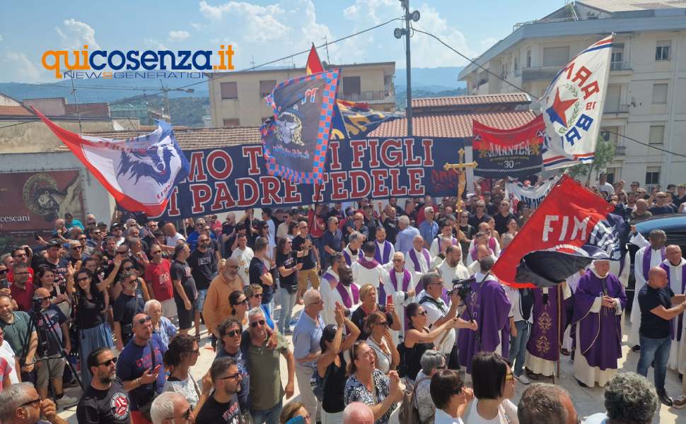 COSENZA – Bandiere, fumogeni, striscioni e quel coro potente, urlato dal sagrato della Chiesa del SS Crocifisso, che era il simbolo di Padre Fedele quando sui gradoni del Marulla guidava e incitava gli ultras del Cosenza durante le partite, con “Maracanà“. Ed oggi, nel giorno dell’ultimo saluto al monaco ultrà, i tantissimi tifosi del Cosenza hanno voluto omaggiare l’uscita del feretro alla fine della celebrazione dei funerali mentre in sottofondo partiva la canzone “Magico Cosenza” di Mario Gualtieri. Era come se in quel momento anche Padre Fedele stesse cantando quel coro indimenticabile.