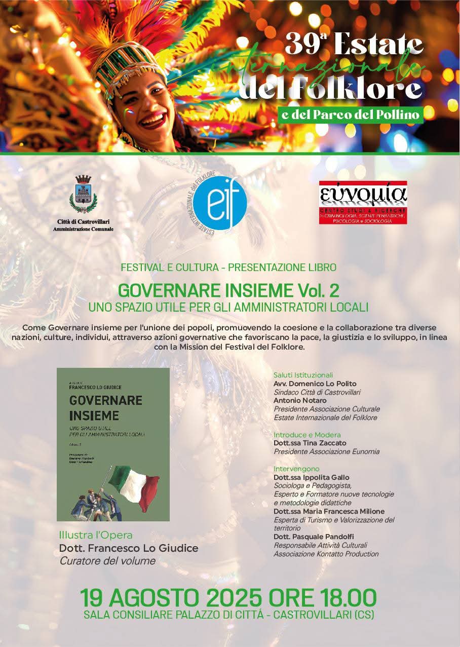 Folkore ma anche cultura. Ieri mattina, nella sala consiliare del Comune, si è tenuto un convegno dell’Associazione Eunomia, presieduta dalla dott.ssa Tina Zaccato che è anche garante per i diritti dei detenuti del carcere di Castrovillari, con la presentazione del libro del Dott. Francesco Lo Giudice “Governare insieme, uno spazio per gli amministratori locali”. All’evento erano presenti anche il Sindaco di Castrovillari Domenico Lo Polito, Antonio Notaro, Presidente dell’associazione Culturale Estate Internazionale del Folklore nonché direttore artistico, Pasquale Pandolfi, responsabile delle attività culturali Associazioni Kontatto Production, Ippolita Gallo, Sociologa e Pedagogista, esperta e formatrice in Nuove Tecnologie didattiche, Maria Francesca Milione, esperta di turismo e valorizzazione del territorio e Francesco Lo Giudice, curatore del volume.