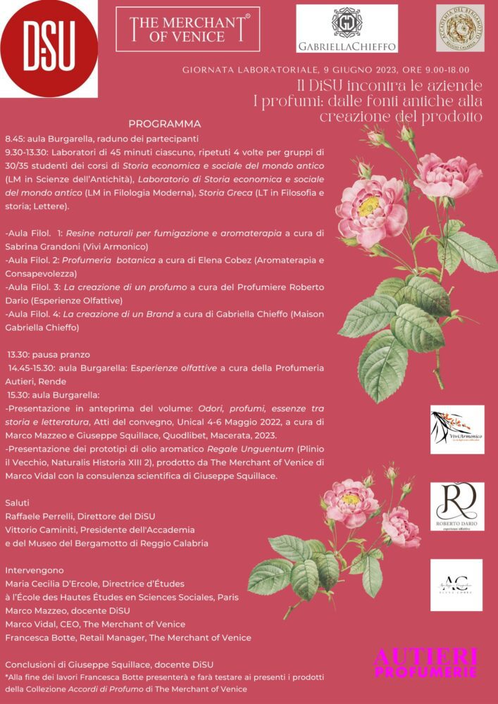 In mattinata sono previsti i laboratori aromatici a cura di Sabrina Grandoni (ViviArmonico), Elena Cobez (esperta in aromaterapia e sensorialità del vino), Roberto Dario (Esperienze Olfattive), Gabriella Chieffo (Maison Gabriella Chieffo), con intermezzo olfattivo della profumeria Autieri di Rende. Nella seduta pomeridiana, moderata da Adelaide Fongoni (docente Disu), dopo i saluti di Raffaele Perrelli, direttore del Disu, e Vittorio Caminiti, presidente dell’Accademia e del Museo del bergamotto di Reggio Calabria, Maria Cecilia D’Ercole (Directrice d’Etudes à l’École des Hautes Études en Sciences Sociales, Parigi) e Marco Mazzeo (docente Disu) presenteranno il volume Per Fumum. Profumi e aromi tra storia e letteratura, curato da Marco Mazzeo e Giuseppe Squillace. Sarà quindi la volta del prototipo del Regale Unguentum, nato dalla collaborazione tra Disu e The Merchant of Venice, che verrà presentato da Marco Vidal (Mavive e The Merchant of Venice) e dal professor Squillace. La chiusura sarà affidata a Francesca Botte (The Merchant of Venice), che farà sentire ai presenti Accordi, la linea di profumi ecosostenibili creata dal brand veneziano.