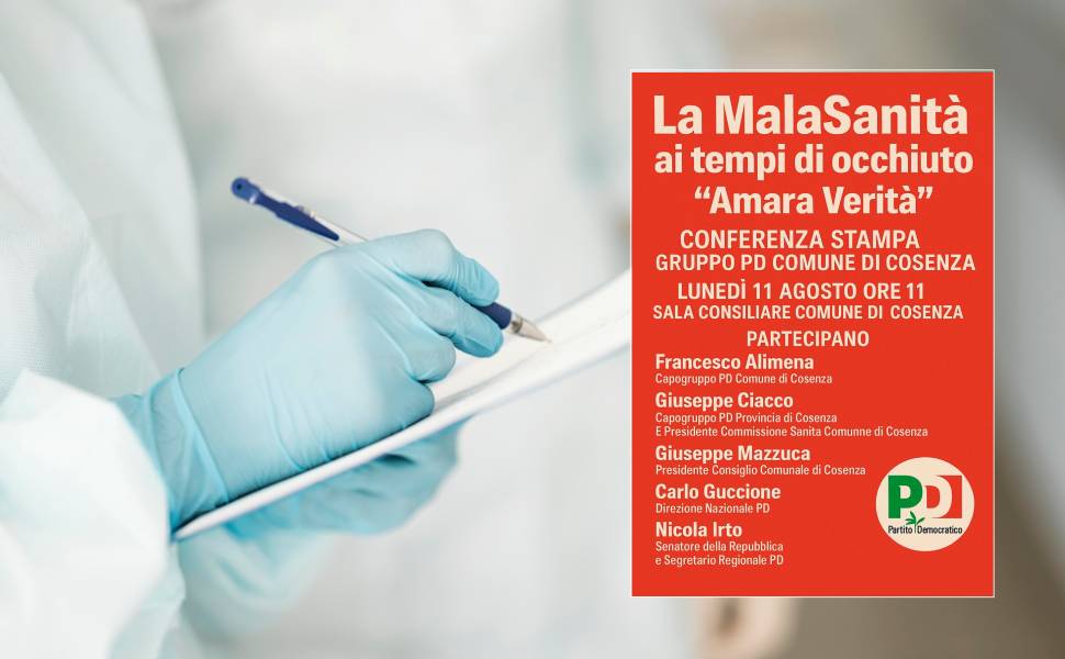 COSENZA – Titolo dell’incontro “La mala sanità ai tempi di Roberto Occhiuto – La verità”. Una presa di posizione contro la gestione della sanità calabrese da parte del Presidente della Regione Roberto Occhiuto arriva dal gruppo consiliare del Partito Democratico del Comune di Cosenza, che annuncia una conferenza stampa pubblica per domani, lunedì 11 agosto alle 11, nella sala consiliare di Palazzo dei Bruzi. Al centro, secondo quanto anticipato, la denuncia serrata della “trasformazione della sanità pubblica in un indecente pascolo a favore di strutture private”, con accuse pesanti nei confronti della Giunta regionale.