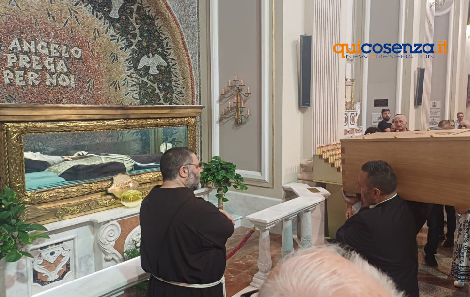La salma è arrivata poco prima dell’ora di pranzo davanti la Basilica di Sant’Angelo d’Acri, accolta dalla commozione dei presenti con palloncini bianchi, lacrime e applausi, mentre un grande striscione recitava “Acqua, luce calcio a Montangola. Amore per gli ultimi nel mondo. Grazie infinitamente padre Fedele“. Poi l’ingresso nella Basilica che conserva i resti del Beato Angelo di Acri (oggi Santo) e la celebrazione di una breve liturgia.