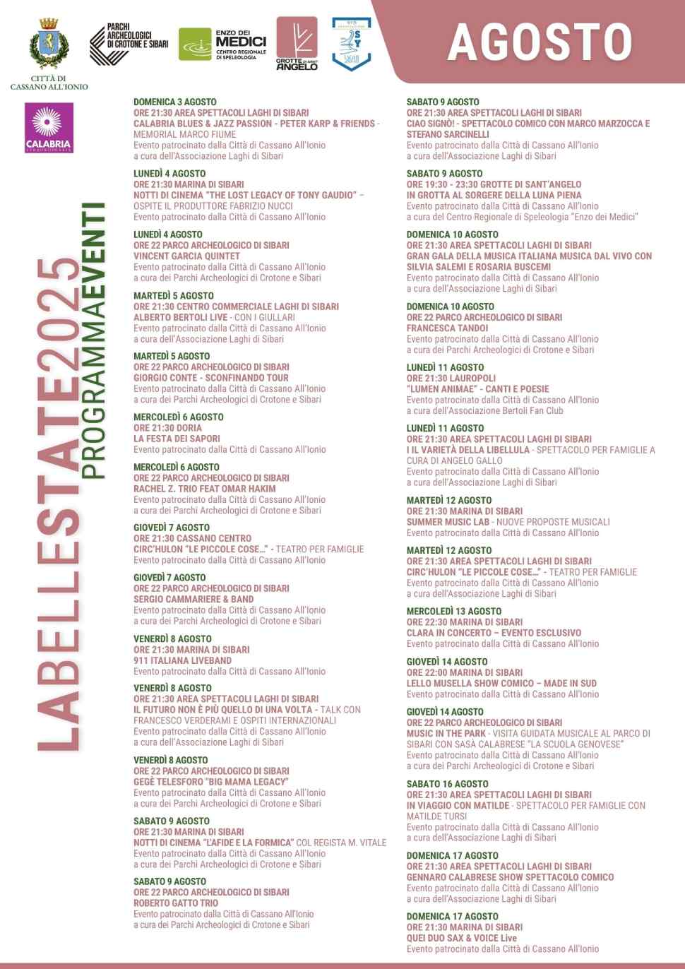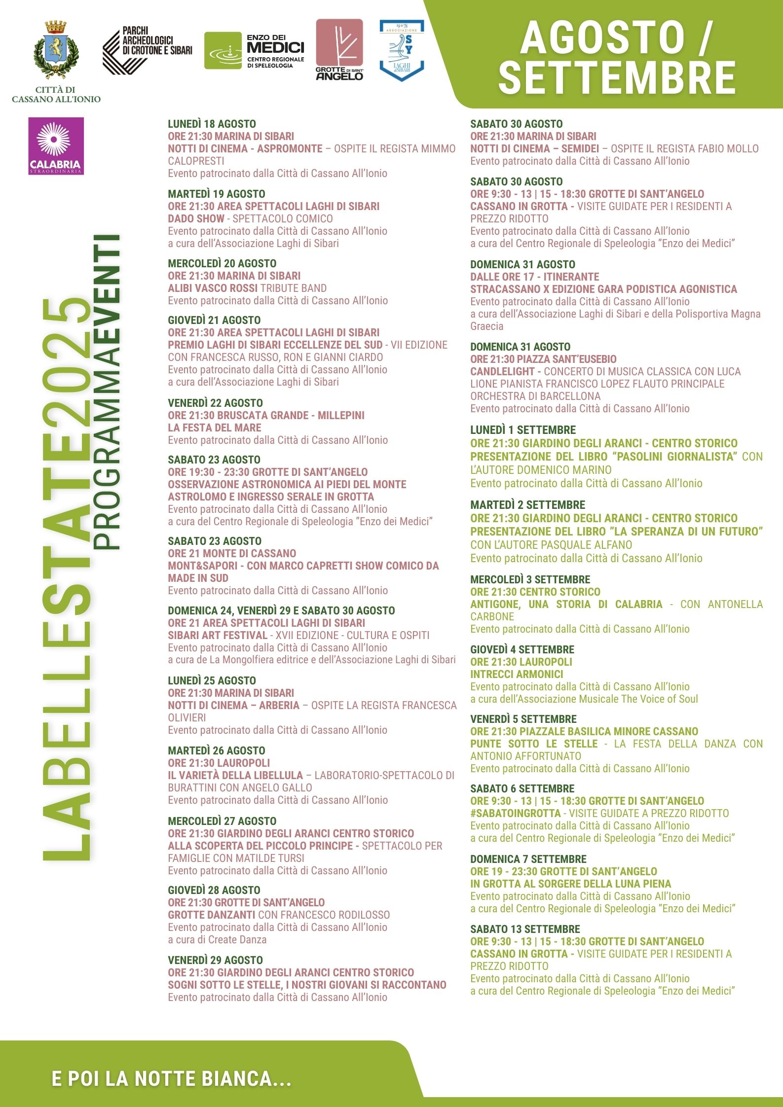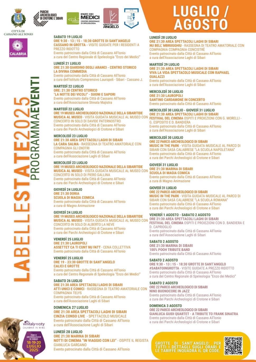 CASSANO ALLO IONIO (CS) – Una rassegna estiva ricchissima “Labellaestate 2025”, patrocinata dalla Città di Cassano All’Ionio e organizzata in collaborazione con i Parchi archeologici di Crotone e Sibari, il Centro Regionale di Speleologia “Enzo dei Medici” e l’Associazione Laghi di Sibari. Un cartellone unico nel suo genere che, da luglio a settembre inoltrato, animerà l’intero territorio con oltre 80 eventi distribuiti tra centro storico, aree costiere, siti archeologici e ambienti naturali.