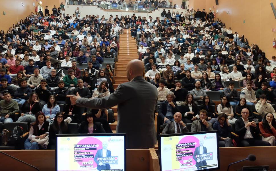 CATANZARO – Quattrocento studenti hanno preso parte, ieri mattina, presso l’Università degli Studi di Catanzaro “Magna Graecia”, alla nona tappa del tour motivazionale di Luca Abete #NonCiFermaNessuno. Progetto itinerante negli atenei italiani, ideato e portato avanti dallo storico inviato di Striscia la notizia, giunto al suo decimo anno di vita. Fulcro centrale di questa campagna sociale gli studenti universitari che, attraverso la modalità del talk, hanno modo di confrontarsi tra loro e con lo stesso Abete per cercare di capire e superare insieme le ansie e le paure che li bloccano così da trovare nuovi strumenti, stimoli e motivazioni per affrontare al meglio le sfide che la vita gli mette davanti.