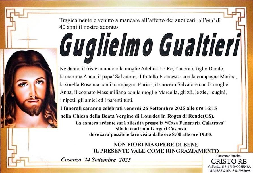 RENDE – Si terranno nel pomeriggio di oggi, alle 16.15, nella chiesa della Beata Vergine di Lourdes, a Roges di Rende, i funerali di Guglielmo Gualtieri, 40 anni, scomparso venerdì scorso mentre era ricoverato in una clinica di Cosenza per un intervento di asportazione della colecisti. La camera ardente è allestita presso la “Casa funeraria Calatrava” in contrada Gergeri a Cosenza.