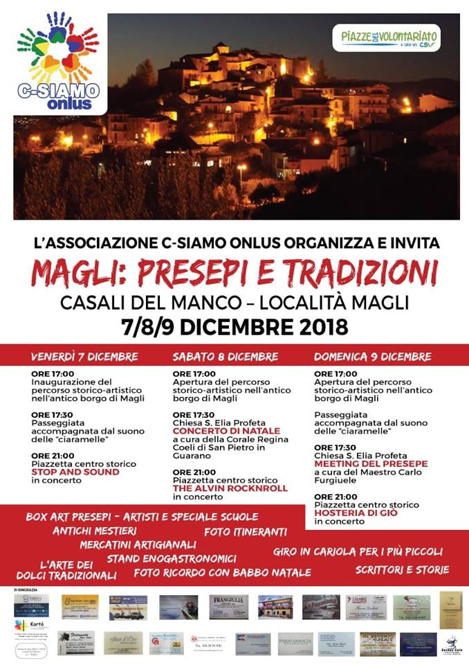 Il contributo richiesto- precisano da C-siamo-è volontario e alla portata di tutte le tasche. Ogni componente di C-siamo: PatriziaCoscarelli, Martina Occhiuto, Maria Giulia Longo, Pasquale Occhiuto, EmiliaCoscarelli, Irene Longo, Noemi Boero, Monica Sacco, Amalia Sirangelo, MarioMassenzo e Armando Vecchio, avrà un compito preciso, così come tutti gli abitantidella contrada coinvolti dall’associazione.“La festa è l’occasione – dice il presidente di C-siamo Onlus Concetta Carravettaperfar conoscere Magli, la sua storia, la bellezza di un paesaggio incastonato nella collina degli ulivi, un paese-presepe da salvare”