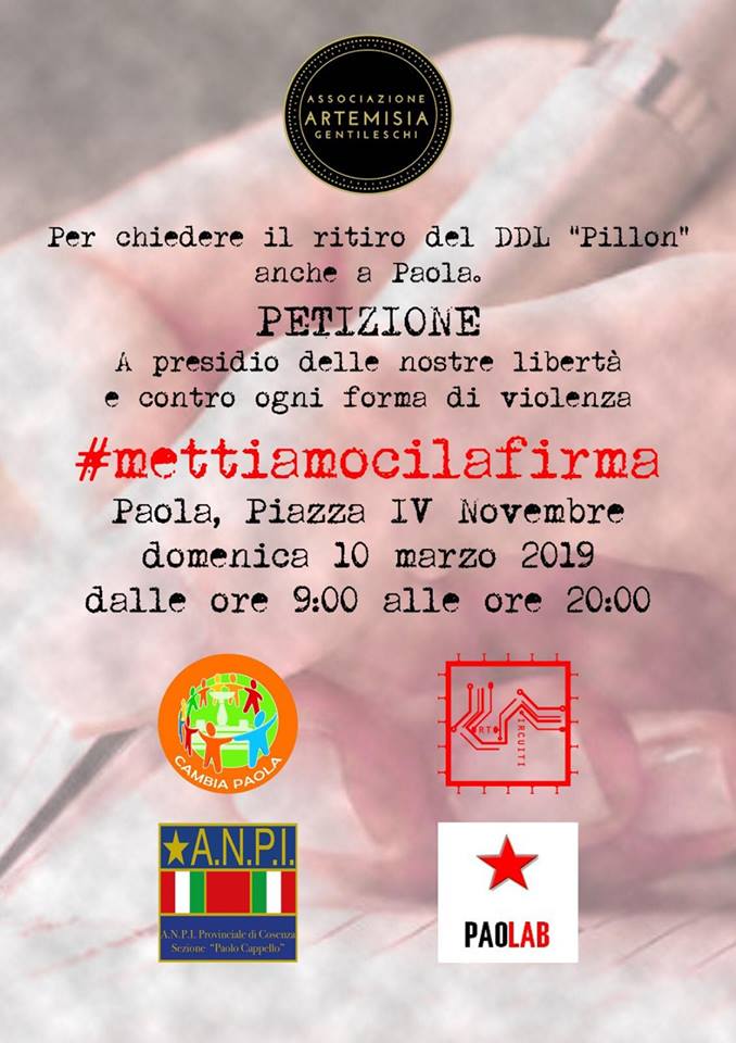 L’Associazione Artemisia Gentileschi, realtà paolana, ha aderito all’iniziativa: “E’ necessario che anche da Paola arrivi forte la ferma opposizione al DDL Pillon, e siamo orgogliosi di farci carico di questa iniziativa, pensata e voluta in sinergia con Cambia Paola (all’esito dell’incontro del 17 novembre in cui, attraverso una “lettura critica” del testo di legge, ne abbiamo sviscerato le vergognose insidie, anche quelle meglio nascoste) e organizzata grazie alla collaborazione con altre associazioni e movimenti. La locandina dell’evento è una chiamata alla mobilitazione, ed infatti l’iniziativa è aperta a tutte le istituzioni, le associazioni, i movimenti e i partiti politici che, come noi, ritengono che il DDL Pillon debba essere ritirato senza indugio alcuno e senza spazio per alcuna modifica, insieme a tutto ciò che rappresenta. Domenica 10 marzo occuperemo per una intera giornata Piazza IV Novembre a Paola raccogliendo le firme di tutti quanti vorranno sostenere questa battaglia di civiltà, e faremo in modo di far pervenire agli Organi dello Stato anche la voce e le firme dei paolani, dei calabresi. Riteniamo che l’attività sul territorio di riferimento sia imprescindibile per una associazione contro la violenza, e il nostro costante impegno in questo senso ha recentemente ottenuto un riconoscimento anche giudiziale, dato che in data 28 febbraio u.s. – proprio in considerazione di quanto fatto nel nostro primo anno di attività, e con l’assistenza dell’avvocato Emilio Perfetti – siamo stati ammessi dal G.u.p. del Tribunale di Paola a costituirci parte civile in un processo penale in cui il soggetto in questione è stato rinviato a giudizio per atti persecutori e in cui la querelante-persona offesa è stata accolta in prima istanza proprio dalla nostra Associazione. Un lavoro intenso e continuo il nostro, che non lascia spazio e tempo a distrazioni o deviazioni dal percorso che – con impegno concreto, oggettivo e indefesso – stiamo cercando di costruire. Il 10 marzo sarà l’occasione per dare un segnale di civiltà e non-violenza, in un momento storico in cui occorre riaffermare con forza i diritti umani e i diritti delle donne, proprio all’indomani di quella festa che, di questi tempi, pare intrisa di un’ipocrisia malamente celata. #mettiamocilafirma, dunque, per la dignità delle donne e degli esseri umani, il 10 marzo in Piazza a Paola dalle ore 9 alle ore 20”.