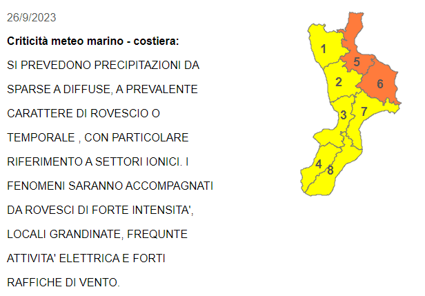 COSENZA – Dalle prime ore di domani previsti temporali su Basilicata, Calabria e Puglia meridionale, in particolare sui settori ionici delle tre regioni. Lo prevede un’allerta meteo della Protezione civile, che indica rovesci di forte intensità, locali grandinate, frequente attività elettrica e forti raffiche di vento. Valutata per la giornata di domani allerta arancione su parte della Basilicata e della Calabria. Valutata inoltre allerta gialla sull’intero territorio di Sicilia, Puglia e sui restanti settori di Basilicata e Calabria.