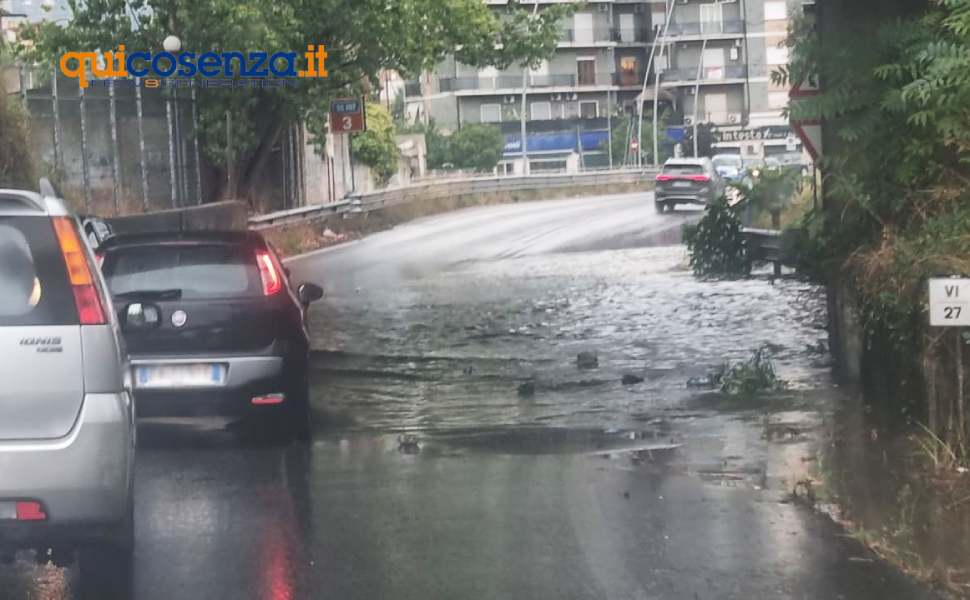 COSENZA – È bastato un temporale di un’ora per causare, in pochi minuti, allagamenti e disagi alla viabilità in città e in diverse zone dell’area urbana con strade completamente allagate e tombini saltati. La pioggia, intensa e improvvisa, nel giro di un’ora ha trasformato alcune strade in fiumi, mettendo in difficoltà automobilisti e mezzi in transito.