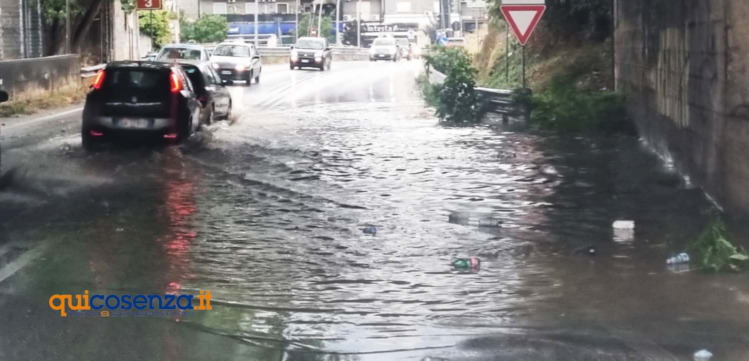 COSENZA – È bastato un temporale di un’ora per causare, in pochi minuti, allagamenti e disagi alla viabilità in città e in diverse zone dell’area urbana con strade completamente allagate e tombini saltati. La pioggia, intensa e improvvisa, nel giro di un’ora ha trasformato alcune strade in fiumi, mettendo in difficoltà automobilisti e mezzi in transito.