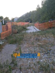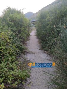 MORMANNO (CS) – Erbacce alte lungo tutto il percorso che crescono rigogliose ed incontrastate per via del caldo e della bella stagione, così tanto da spuntare lungo tutto il sentiero, oltre la ghiaia, ed invadere il percorso rendendo difficile la camminata. Le palizzate laterali praticamente ingoiate dal verde e “resti” di lavori non ancora ultimati come reti di cantiere e recinzioni di metallo.