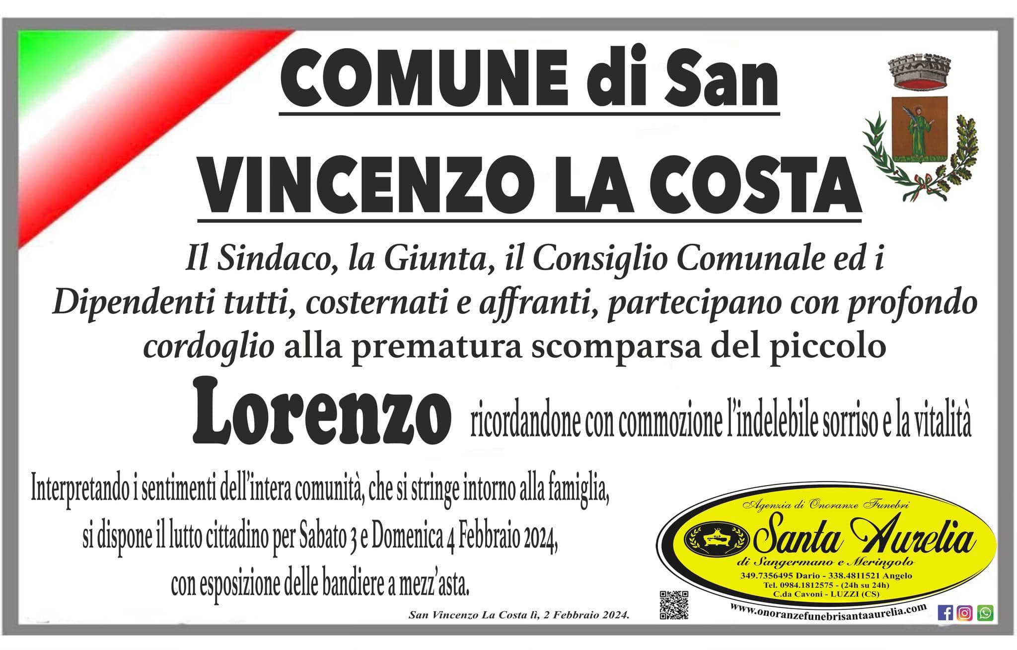 SAN VINCENZO LA COSTA (CS) – Dolore e sgomento a San Vincenzo la Costa per la scomparsa prematura di Lorenzo Chiari, il bimbo di 10 anni morto oggi all’ospedale pediatrico Bambino Gesù di Roma a causa di una grave malattia.