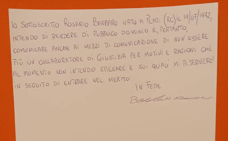 “Io sottoscritto Rosario Barbaro nato a Platì (RC) il 19/07/1972, intendo rendere di pubblico dominio e, pertanto, comunicare anche ai mezzi di comunicazione di non essere più un collaboratore di giustizia per motivi e ragioni che al momento non intendo spiegare e sui quali mi riserverò in seguito di entrare nel merito”.