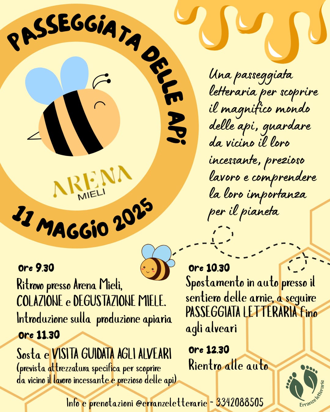 MONTALTO UFFUGO (CS) – Erranze letterarie e Arena Mieli presentano la “Passeggiata delle api” che si terrà domani, domenica 11 maggio 2025, a partire dalle ore 9.30, con ritrovo presso la sede di Arena Mieli in Via Ragusa 39 a Montalto Uffugo. Un’occasione unica per immergersi nella meraviglia del mondo apiario, accompagnati da parole, sapori e natura. Una speciale passeggiata letteraria dedicata alle api, custodi silenziose della biodiversità e protagoniste di un ecosistema tanto delicato quanto affascinante.