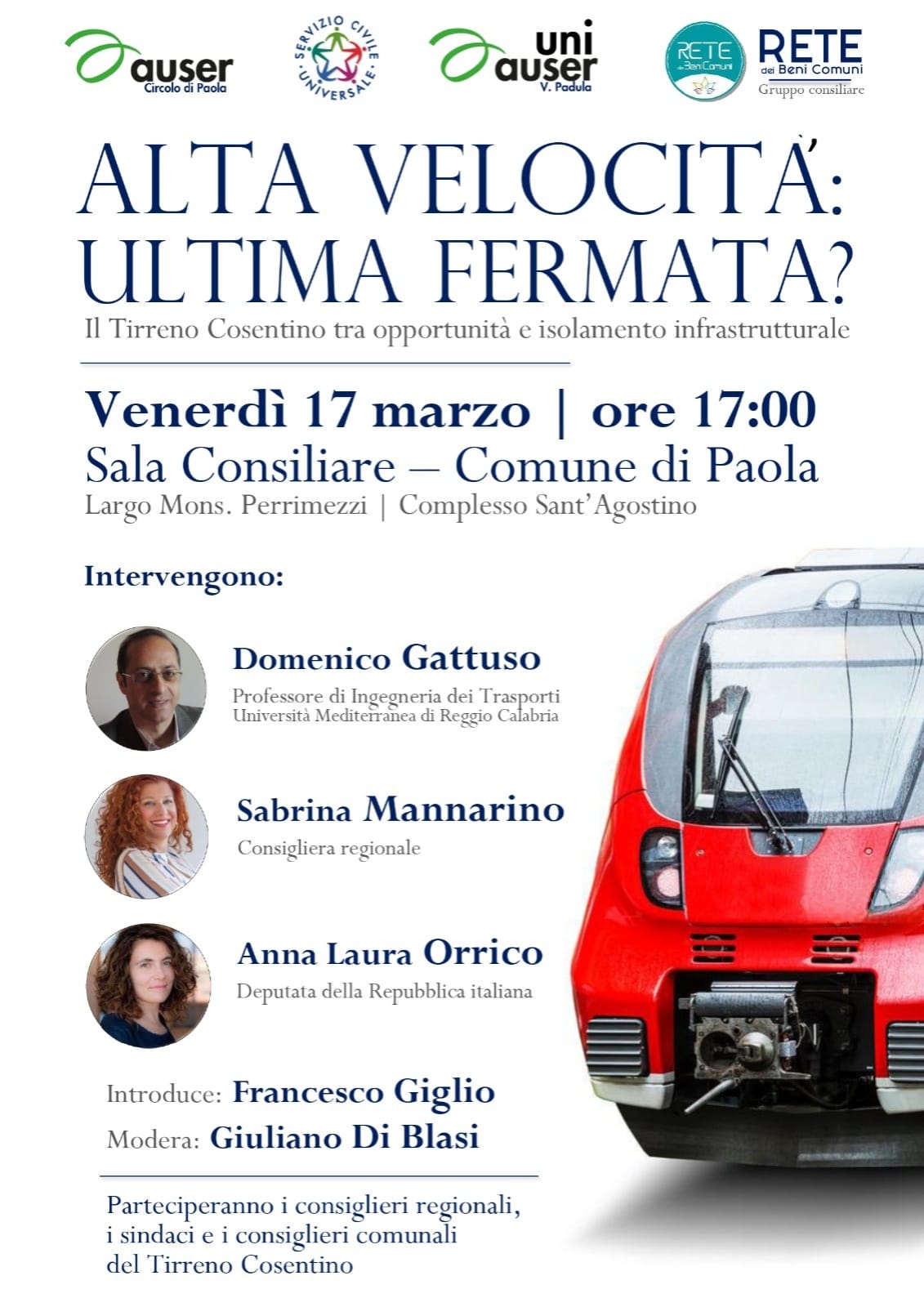 PAOLA (CS) – Si intitola “Alta velocità, ultima fermata? Un dibattito pubblico per una visione comune del territorio”. Il progetto di Raddoppio della Galleria Santomarco, proposto da Rfi Spa come opera strettamente correlata al tracciato dell’Alta Velocità in Calabria, sarà al centro del dibattito che si terrà domani, venerdì 17 marzo alle 17, nella sala consiliare del Comune di Paola.