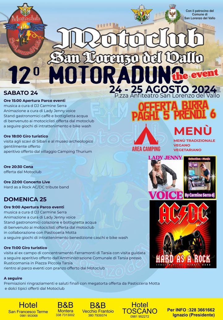 Alle ore 15 domani, il Motoraduno inizierà ufficialmente con l’apertura del parco eventi. Ad accogliere i partecipanti ci sarà la musica del DJ Carmine Serra e l’animazione di Lady Jenny. Gli stand gastronomici offriranno caffè e una bottiglietta d’acqua ai motociclisti, come benvenuto del Motoclub organizzatore. Non mancheranno i giochi di intrattenimento e il tradizionale bike wash. Successivamente, i motociclisti potranno partecipare a un tour turistico gratuito, con visita agli scavi archeologici e al museo di Sibari. L’aperitivo sarà offerto dal Villaggio Camping Thurium, un momento di relax in un contesto storico e naturale di grande bellezza. La serata proseguirà con una cena conviviale, offerta dal Motoclub, che sarà l’occasione per socializzare e condividere la passione per le moto. La giornata si concluderà con il concerto degli Hard as a Rock, tribute band degli AC/DC, che infiammeranno la serata con i grandi classici della storica rock band australiana.