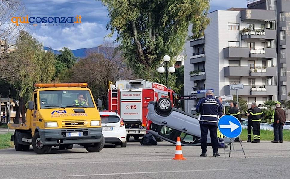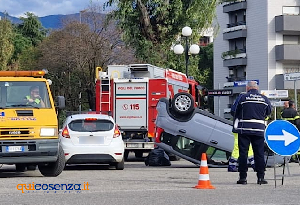 Paurosa carambola a Rende: auto si ribalta su via Rossini. Intervengono i vigili del fuoco