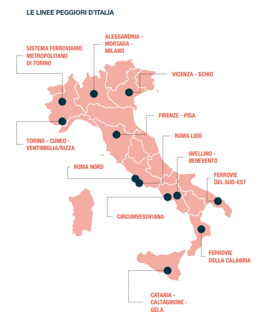 Nel report di Pendolaria viene evidenziato che il progetto per il Ponte sullo Stretto di Messina sta drenando risorse fondamentali per il Sud. Lo scorso anno 1.6 milioni sono stati dirottati dalla quota dei Fondi per lo sviluppo e la coesione destinati direttamente alle regioni Calabria e Sicilia, mentre ora sono state alleggerite ulteriormente (da 9,3 a 6,9 miliardi) le spese a carico dello Stato, aumentando da 2,3 a 7,7 miliardi il contributo FSC. L’aspetto drammatico è che oltre l’87% degli stanziamenti infrastrutturali fino al 2038 riguarderanno il Ponte sullo Stretto, quando rimangono situazioni come quella della linea Palermo-Trapani via Milo (chiusa dal 2013 a causa di alcuni smottamenti di terreno), della Caltagirone-Gela (chiusa a causa del crollo del Ponte Carbone l’8 maggio 2011) o quelle delle linee a scartamento ridotto che da Gioia Tauro portano a Palmi e a Cinquefrondi in Calabria, il cui servizio è sospeso da 13 anni e dove non vi è alcun progetto concreto di riattivazione.