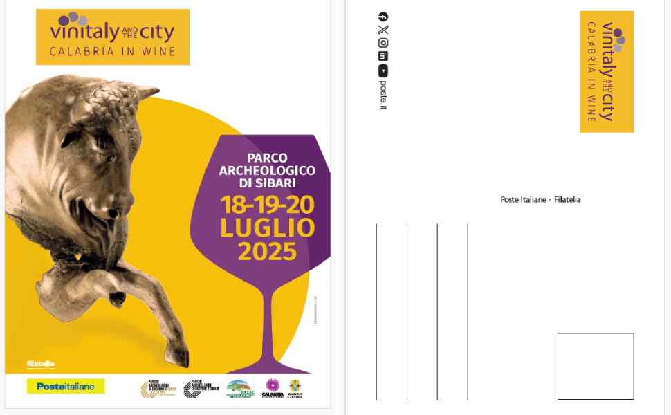 COSENZA – In occasione della seconda edizione della manifestazione “Vinitaly and the city” che si terrà presso il Parco archeologico di Sibari dal 18 al 20 luglio prossimi, Poste Italiane attiverà un servizio filatelico temporaneo con un bollo speciale per ciascuna serata e con la dicitura: “Vinitaly and the city – Calabria in wine – 18.7.2025 – 87011 Sibari Stazione (CS)”, richiesto dall’Arsac.