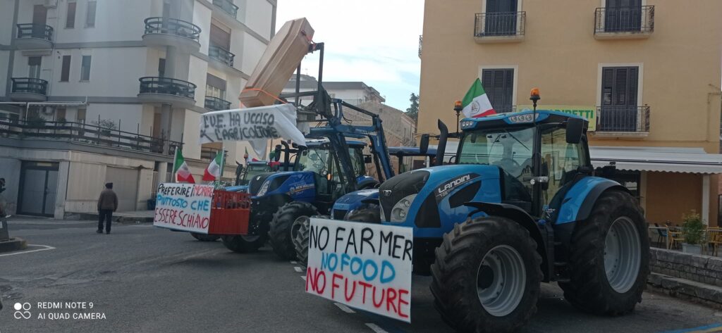 CASTROVILLARI (CS) – “L’Ue ha ucciso gli agricoltori”. Sono alcune delle scritte sugli striscione che campeggiano sui trattori in corteo da questa mattina a Castrovillari. La protesta, che va avanti ormai da più di 10 giorni, non si arresta nel cosentino e oggi paralizza anche il centro urbano ai piedi del Pollino. “Questa lotta la facciamo anche per il tuo futuro, ci scusiamo per il disagio”, si legge da un’altra parte. Gli imprenditori del settore non ci stanno più e non arretrano di un passo da quelle che sono richieste leggittime. Preservare e tutelare il made in Italy è la parola d’ordine, per dare battaglia al commercio di grano estero che si presenta in Italia sotto mentite spoglie, sugli scaffali che pubblicizzano brand italiani. “Mangiamo pesticidi, ecco perché protestiamo”, è lo sfogo che abbiamo raccolto ieri da un’azienda agricola delle Serre Cosentine.