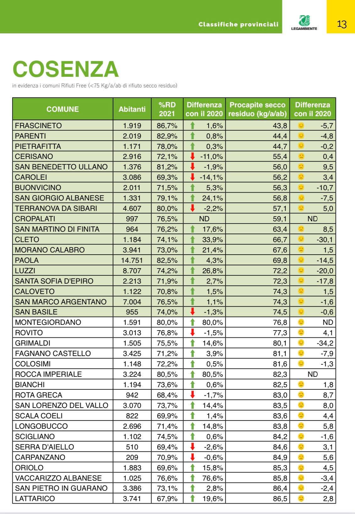 COSENZA – L’Amministrazione comunale di Frascineto, per il quinto anno consecutivo è Comune Rifiuti Free, uno dei riconoscimenti più importanti nell’ambito delle politiche per la salvaguardia ambientale e per il corretto riciclo dei rifiuti. Non solo. Il comune arbëreshe è risultato essere il primo tra gli enti comunali virtuosi della Provincia di Cosenza (secondo in Calabria) con una percentuale di Raccolta Differenziata pari all’86.7% ed una produzione di rifiuto secco pro capite al di sotto dei 60kg/annuo. Subito dopo in seconda posizione troviamo Parenti, terzo nella Regione Calabria.