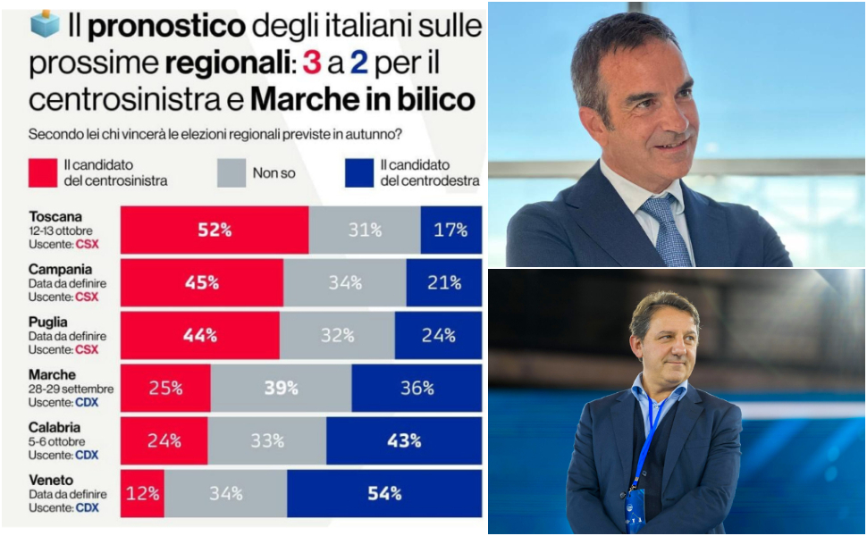 Il centrosinistra ha tre uscenti – in Toscana, Campania e Puglia – e secondo gli italiani si confermerebbe alla guida di queste regioni, così come il centrodestra rivincerebbe in Veneto e Calabria. Nelle Marche, in cui il presidente uscente è Francesco Acquaroli di Fratelli d’Italia, l’esito è invece molto incerto: il 25% pronostica una vittoria di Ricci e il 36% di Acquaroli, ma il 39% non sa. Per la maggioranza del campione (52%) queste elezioni regionali non avranno comunque effetti concreti sulla stabilità del Governo Meloni.