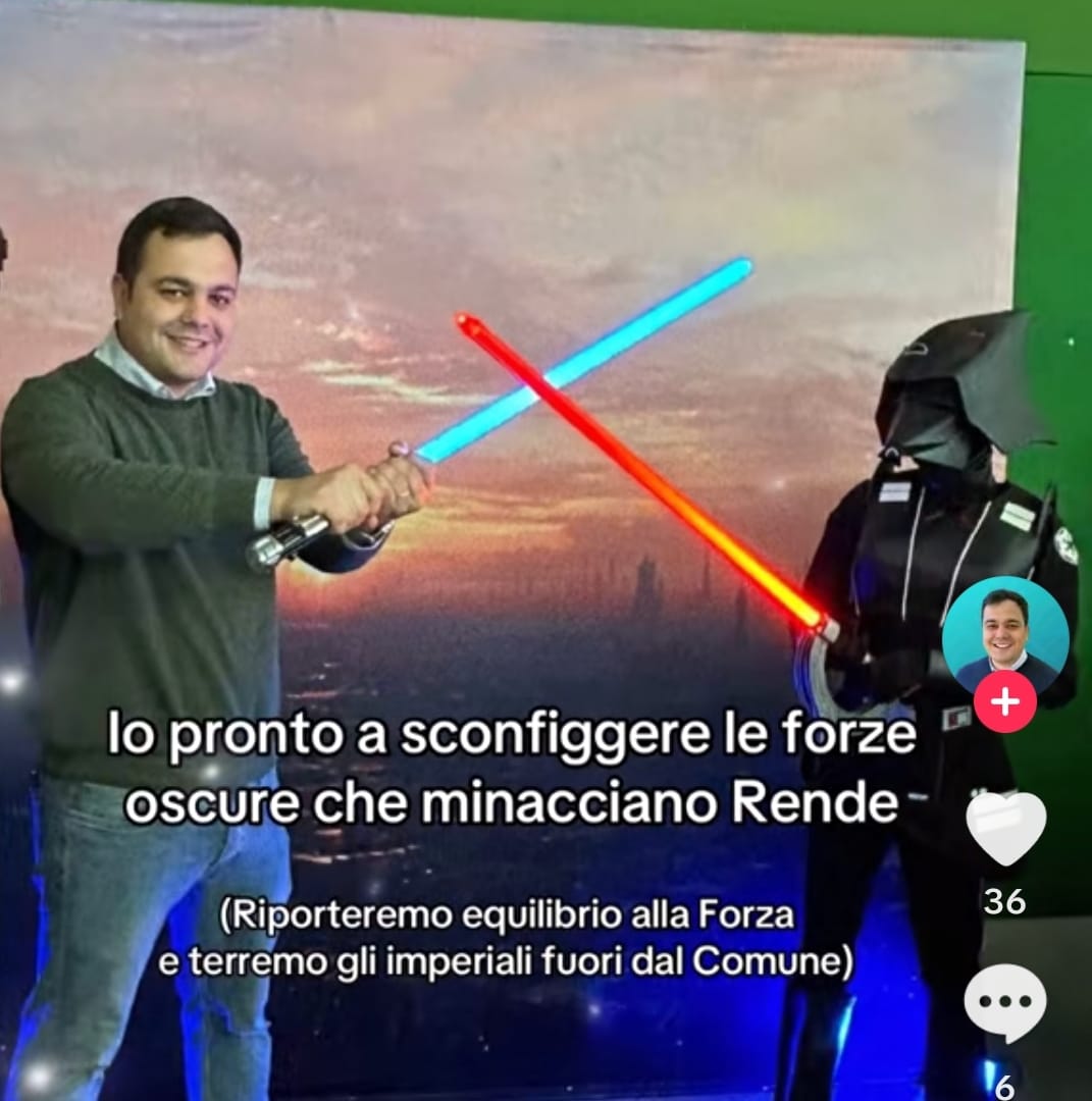 Lo stesso linguaggio di Bilotti, è palesemente rivolto ai millennial (quale lui è): “Mi chiamo Giovanni, sono un ingegnere, un attivista del territorio…”. Conoscendo bene lo strumento, Bilotti crea dibattito nei commenti e non è passato inosservato il suo fotomontaggio con le spade laser di Star Wars.