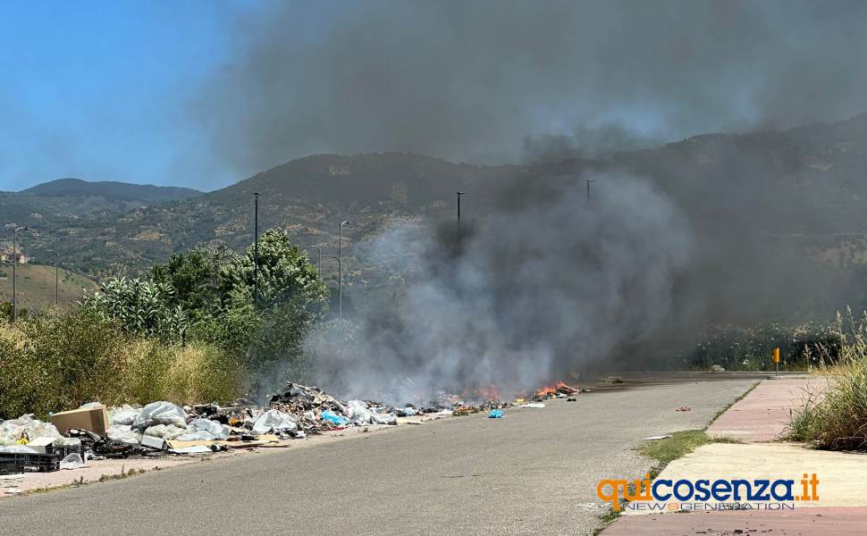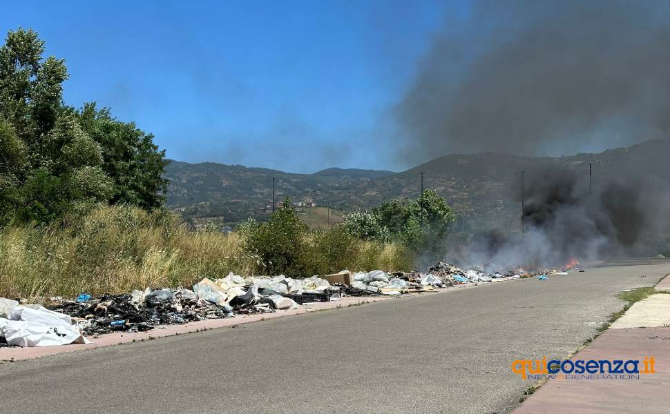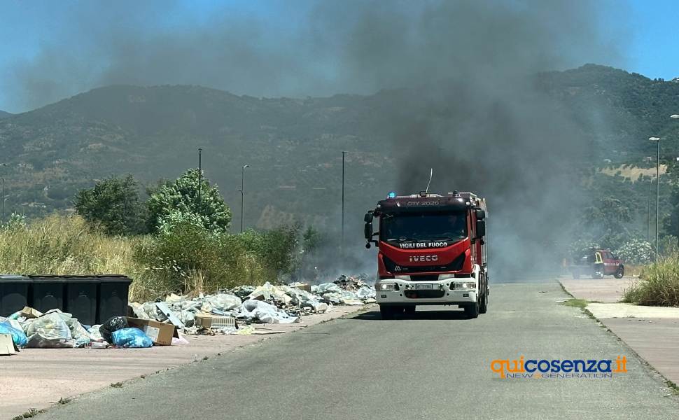 Rende, brucia la discarica a cielo aperto su viale Principe: in fiamme l’ammasso di rifiuti – FOTO