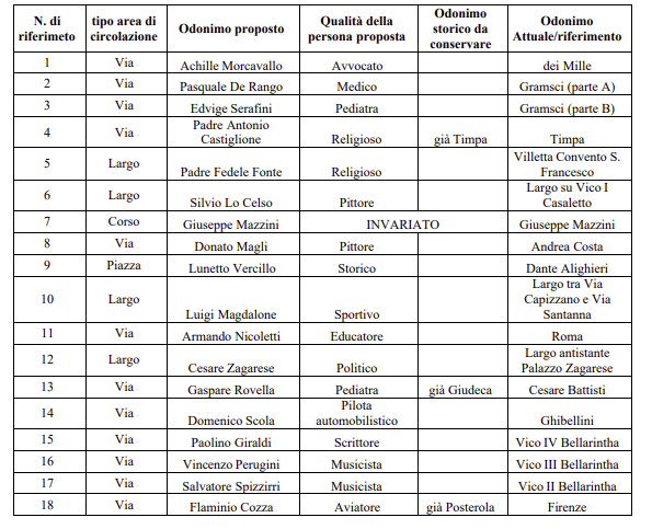 I Commissari straordinari di Rende Santi Giuffrè, Rosa Correale e Michele Albertini “ritendo la proposta suddetta ragionevole” hanno revocato, dunque, la Delibera di Giunta Comunale n.1 del 13/01/2022 in modo tale da portare “all’attenzione dell’organo di governo della città, nelle more di una revisione complessiva della toponomastica del nucleo storico che possa individuare compiutamente i toponimi da sostituire, in completo accordo con la Prefettura di Cosenza”.