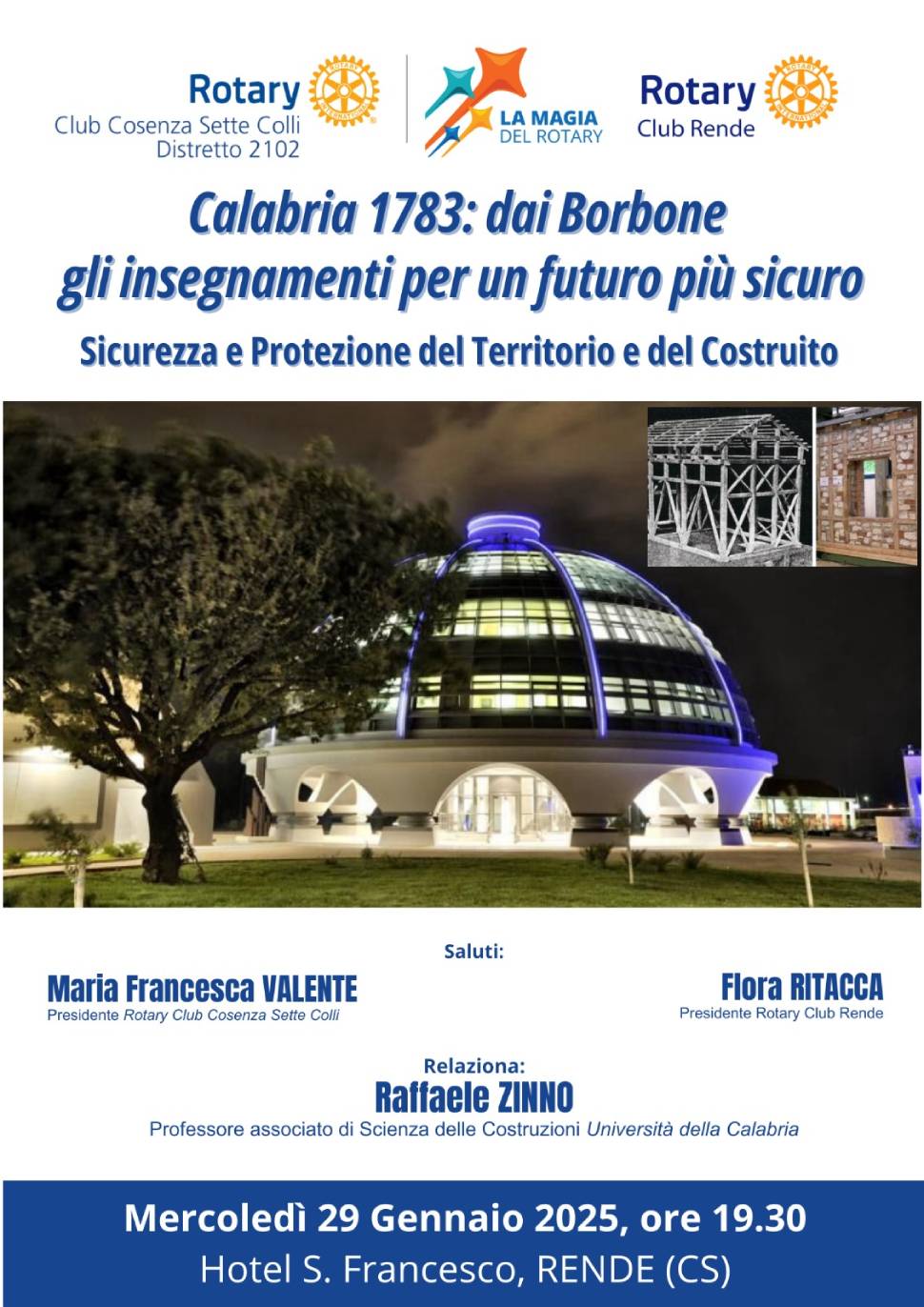 Il Rotary Club Cosenza Sette Colli, guidato per l’Anno Rotariano 2023/2024 da Maria Francesca Valente, ha condiviso l’impostazione della Commissione ed ha organizzato, insieme al Rotary Club di Rende, guidato da Flora Maria Ritacca, un incontro pubblico dal titolo “Calabria 1783: dai Borbone gli insegnamenti per un futuro più sicuro – Sicurezza e Protezione del Territorio e del Costruito”. L’iniziativa si svolgerà domani, mercoledì 29 Gennaio 2025 alle ore 19.30 presso l’Hotel S. Francesco di Rende e vedrà la relazione del prof. Raffaele Zinno.