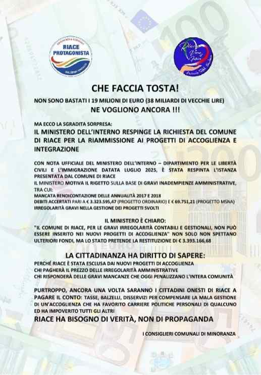 In un volantino affisso per le strade del paese, i gruppi Riace Protagonista e Riace verso il Futuro hanno reso noto che il Ministero dell’Interno ha ufficialmente respinto la richiesta del Comune di Riace per rientrare nei progetti di accoglienza e integrazione. Le motivazioni sono pesanti: mancata rendicontazione di fondi, debiti certificati per oltre 3,3 milioni di euro e gravi irregolarità amministrative.