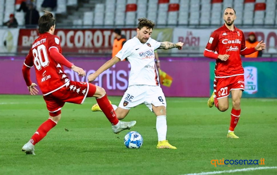 BARI – Niente da fare. Il Cosenza torna sconfitto dalla difficile trasferta di Bari (è il quarto KO di fila lontano dal Marulla, il settimo in otto gare fuori casa) e resta inchiodato all’ultimo posto in classifica. Non è bastato ai rossoblu, spinti dal tifo incessante di oltre 1100 tifosi, un discreto primo tempo, chiuso in parità dopo aver incassato praticamente subito il goal del Bari, avanti con un destro dalla distanza di Esposito (che sorprende Micai sul primo palo) e aver pareggiato al 23′ con l’inzuccata di Rispoli, bravo a raccogliere un cross corto di Brescianini.