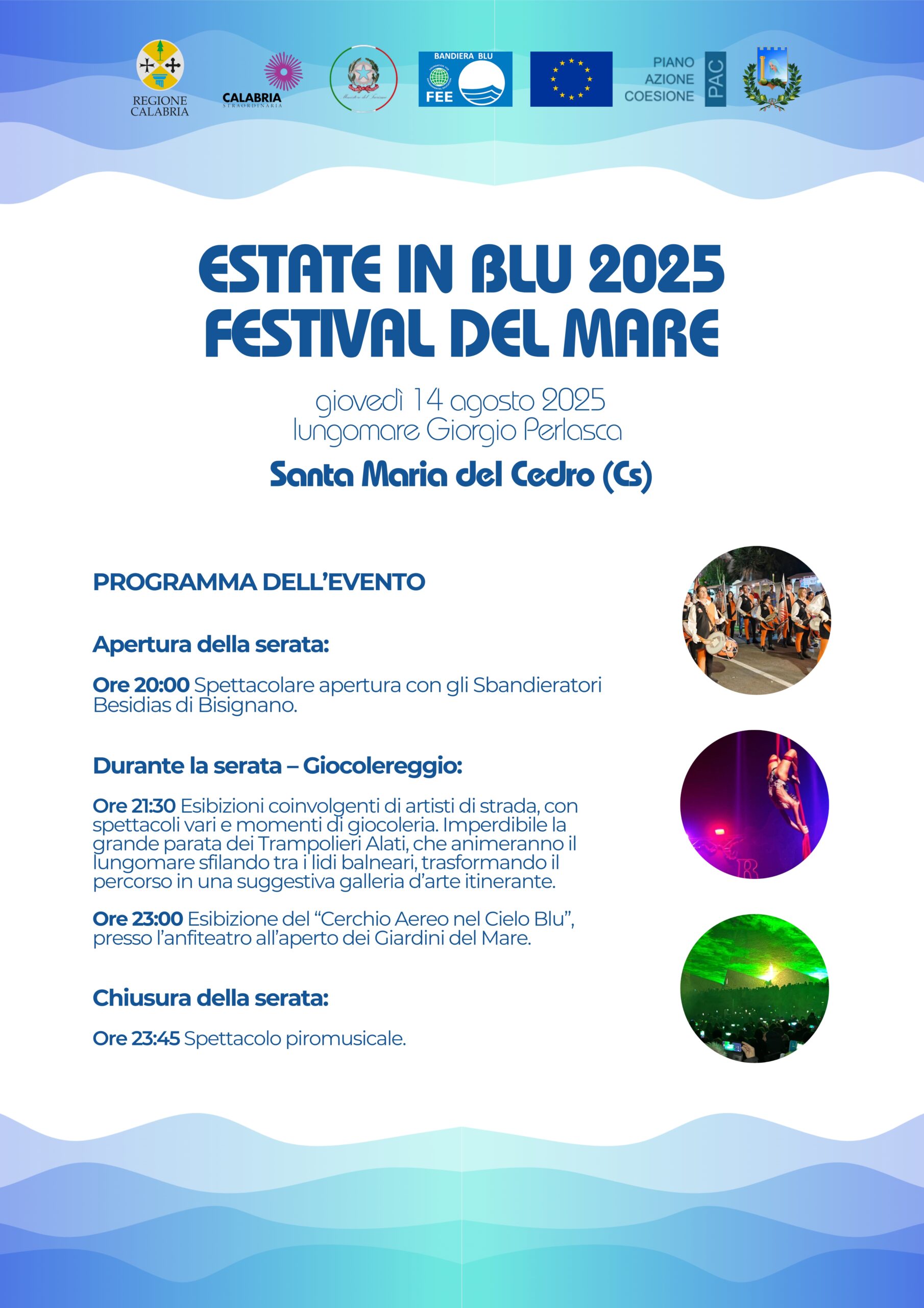SANTA MARIA DEL CEDRO (CS) – Tutto pronto per l’evento dedicato alla Bandiera Blu: “Estate in Blu 2025 – Festival del Mare” in programma giovedì 14 agosto sul lungomare Giorgio Perlasca di Santa Maria del Cedro.
