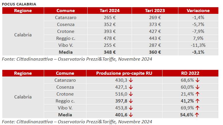 COSENZA – Diminuisce del 3,1% rispetto al 2023 la spesa sostenuta da una famiglia calabrese per la tariffa dei rifiuti: in media nel 2024 è di 348€ rispetto ai 360€ dello scorso anno. Spiccano le differenze fra i singoli capoluoghi: 478€ a Reggio Calabria, 265€ a Catanzaro, mentre a Vibo Valentia la diminuzione è stata pari al 11,3%. A livello nazionale la spesa si attesta sui 329€, con un aumento del 2,6% rispetto all’anno precedente.