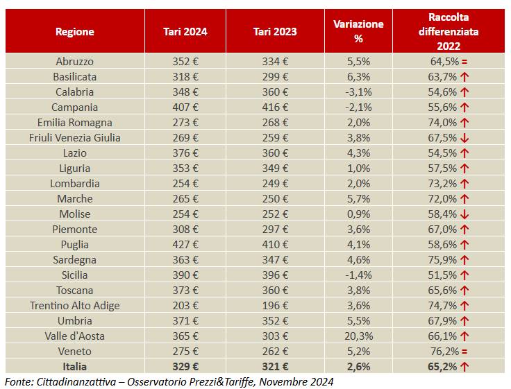Nel 2024 la spesa media annuale per la famiglia tipo individuata è di €329 con un aumento del 2,6% circa rispetto all’anno precedente. Il Trentino Alto Adige è la regione più economica (203€), mentre la Puglia è la più costosa (426,50€ con un aumento di oltre il 4% rispetto all’anno precedente). Catania è il capoluogo di provincia in cui, come lo scorso anno, si paga di più: 594€ annui, senza variazioni sul 2023; Trento invece è quello in cui si paga meno: 183€, di poco inferiore rispetto al 2023. Dalla top ten dei capoluoghi più costosi escono Benevento, Latina, Messina e Salerno; entrano invece Andria, Cagliari, Pistoia e Trapani. Dalla top ten dei meno cari, esce Bolzano ed entra Siena.