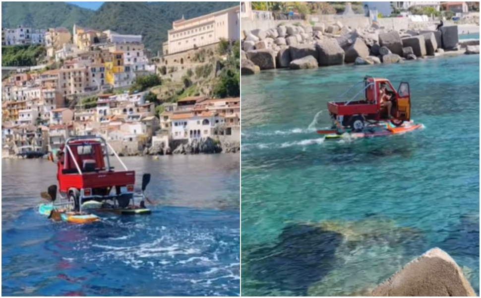 SCILLA (RC) – Un’Ape Cross 50 trasformata in un mezzo capace di muoversi sulle acque del mare di Scilla, in provincia di Reggio Calabria. È questa l’ingegnosa creazione realizzata da Massimiliano Macrì, appassionato di motori e creatore di modellini, che nelle ultime ore sta facendo letteralmente impazzire il web. Il video delle sue performance sulle acque della Costa Viola, alla guida dell’iconico tre ruote rosso posizionato su due tavole da surf colorate ed un sistema di eliche artigianali, sta impazzando sui social tra condivisioni e commenti.