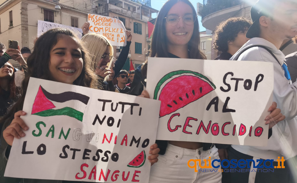 COSENZA – Anche Cosenza si unisce alla mobilitazione nazionale per la Palestina. Dopo la grande partecipazione alla manifestazione a settembre, che ha visto oltre mezzo milione di persone in piazza in tutta Italia, e il corteo di ieri sera, ancora una volta la città dei Bruzi risponde ‘presente’ con una manifestazione che attraversa le strade del centro in direzione del Comune per poi risalire verso via Roma.