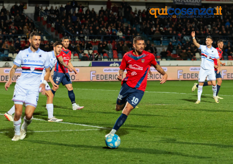 Una gara da mordersi le mani, buttata in appena tre minuti, per un black-out della difesa del Cosenza che ha consentito prima a Darboe al 23′ e poi a De Luca al 26′ di mettere due goal di vantaggio a favore dei blucerchiati che hanno praticamente campato di rendita. Una mazzata per le speranze del Cosenza, che ci ha messo comunque grinta e determinazione, attaccando e chiudendo i blucerchiati nella propria metà campo e riuscendo a trovare il goal del due a uno solo al 74’con il “colpo di spalla” di Frabotta sull’ennesimo angolo battuto dal Cosenza. Eloquente il dato finale di corner: 12 a 0 per il Cosenza. Inutile l’assalto finale del Cosenza, il risultato non cambia e il Cosenza deve ingoiare il boccone amaro della sconfitta. Adesso, pochi giorni di riposo prima del match infrasettimanale contro la capolista Parma.