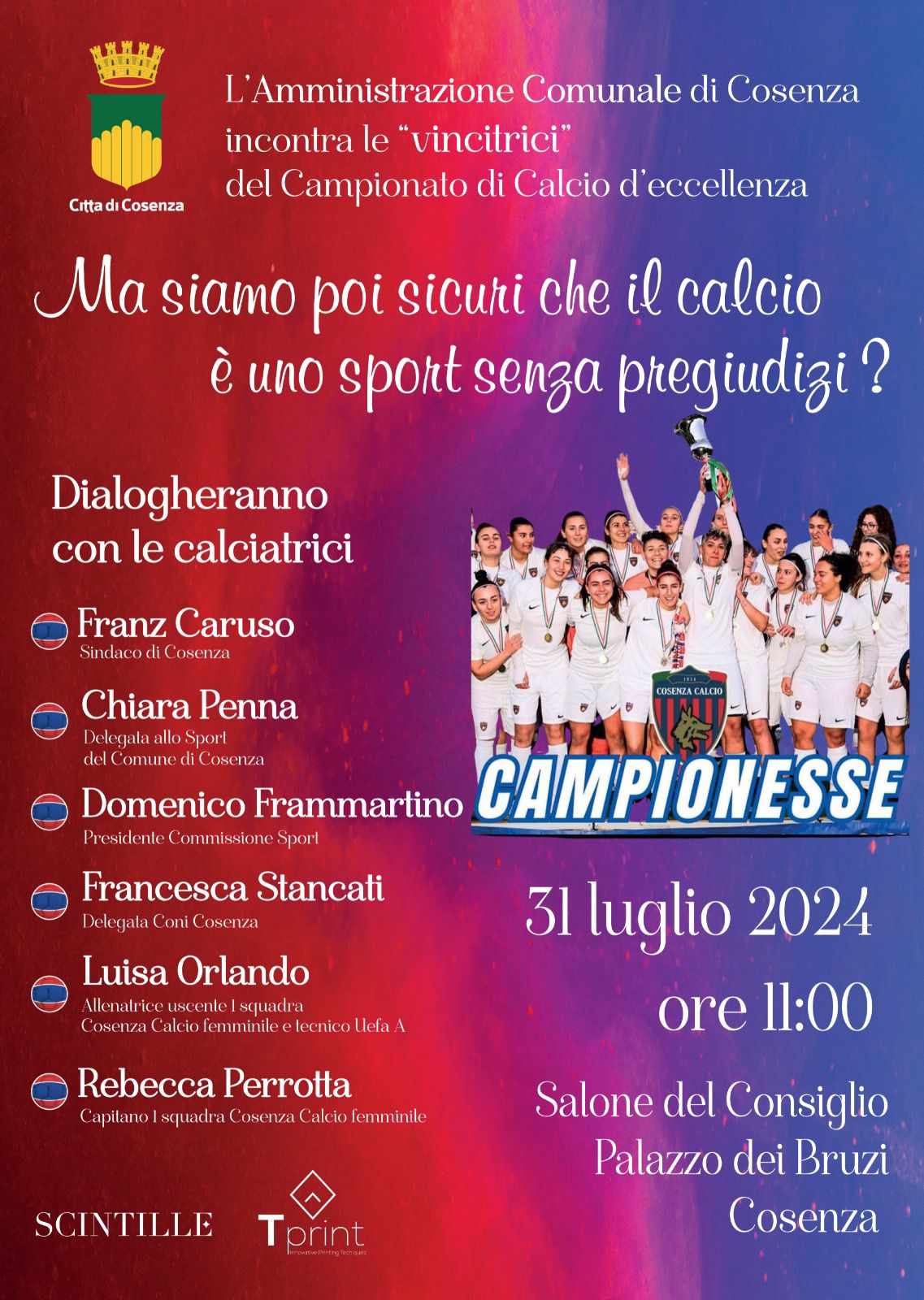 L’incontro a Palazzo dei Bruzi, dal titolo “Ma siamo poi sicuri che il calcio è uno sport senza pregiudizi?” vedrà la partecipazione del sindaco Franz Caruso, della consigliera delegata allo sport del sindaco, Chiara Penna e del presidente della commissione sport di Palazzo dei Bruzi, Mimmo Frammartino. Saranno presenti anche la delegata del Coni Cosenza, Francesca Stancati, l’allenatrice della squadra del Cosenza calcio femminile, Luisa Orlando, che è anche tecnico Uefa A, e Rebecca Perrotta, capitano della prima squadra del Cosenza femminile.