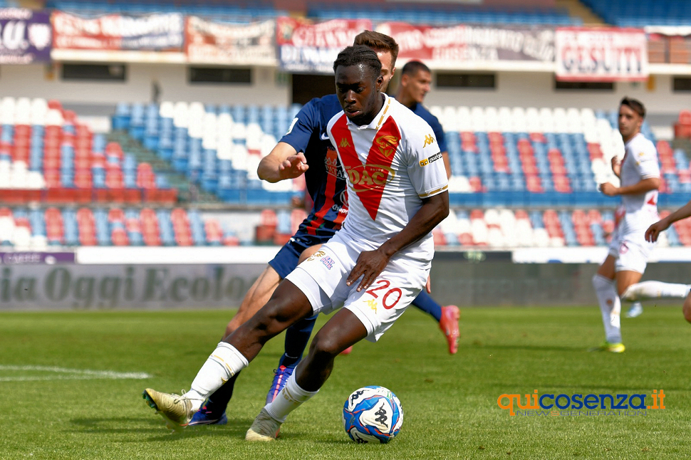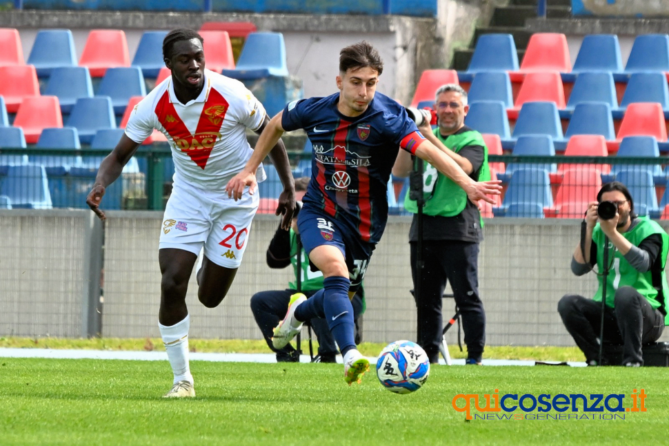 Il primo squillo della gara è del Cosenza al minuto 3′: cross di Rizzo Pina dalla destra per la testa di Artistico che anticipa Adorni e gira verso la porta con Lezzerini che blocca la sfera. Il Cosenza fa la partita cercando si sfondare sulle fasce anche se al 16′ i rossoblu rischiano su un corner battuto dalla destra con la conclusione di Borrelli e il colpo di testa di Besaggio deviato quasi sulla linea da Ricci. Capovolgimento di fronte e sul primo corner del Cosenza serve un grande intervento di Lezzerini per deviare il colpo di testa di Cimino che nega il vantaggio al Cosenza. Si va da una parte e dall’altra con le due squadre a sfidarsi a viso aperto.