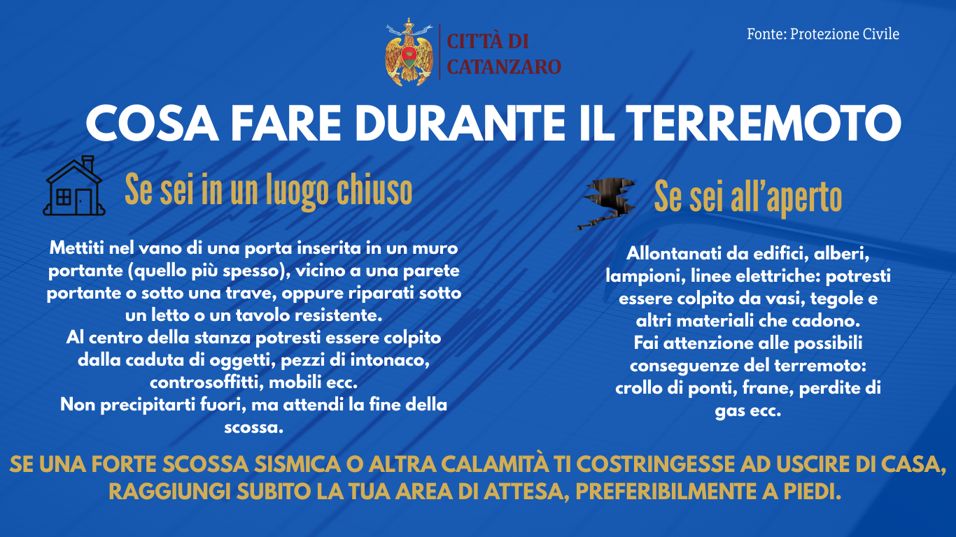 L’Amministrazione Comunale di Catanzaro informa che, a seguito delle scosse di terremoto registrate gli uffici competenti hanno effettuato le necessarie verifiche e, al momento, non risultano segnalazioni di danni a persone o cose. Si invita la cittadinanza a mantenere la calma e a seguire scrupolosamente le indicazioni contenute nell’opuscolo online del Comune.