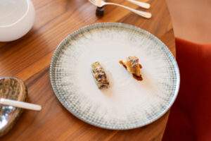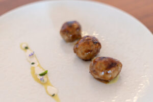 - Verza, sogliola e garum: il garum è una salsa che risale all’Antica Roma, ottenuta da una salamoia fatta da scarti di sardine non utilizzati nei piatti del menù, perché nulla vada sprecato utilizzando quasi il tutto dalle materie prime;