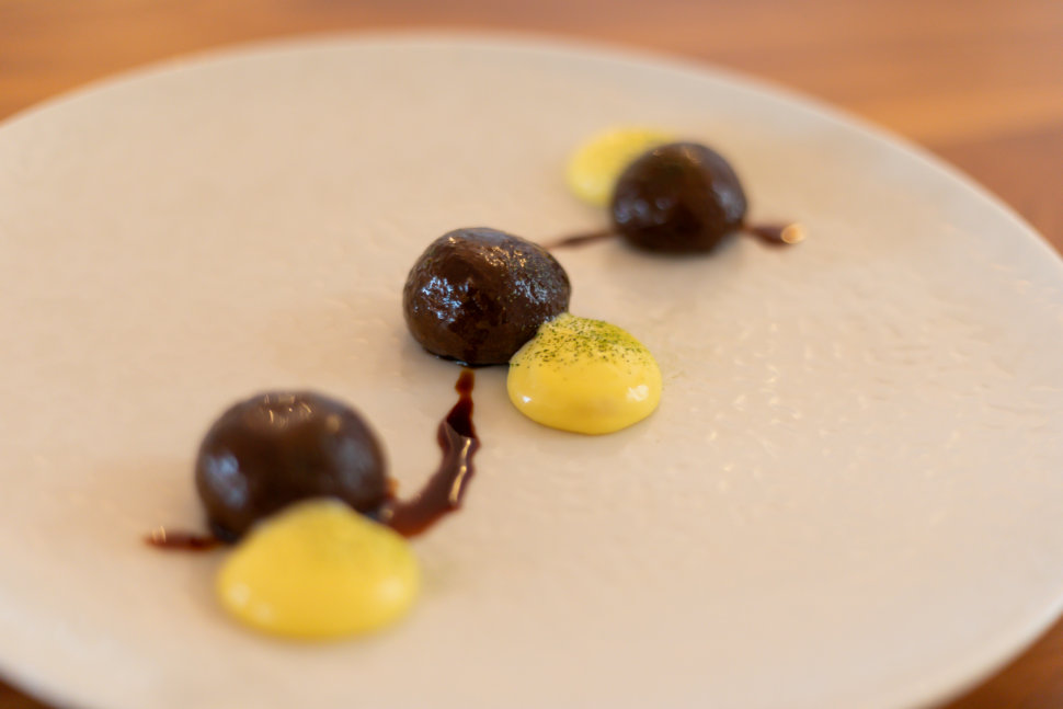 - Verza, sogliola e garum: il garum è una salsa che risale all’Antica Roma, ottenuta da una salamoia fatta da scarti di sardine non utilizzati nei piatti del menù, perché nulla vada sprecato utilizzando quasi il tutto dalle materie prime;